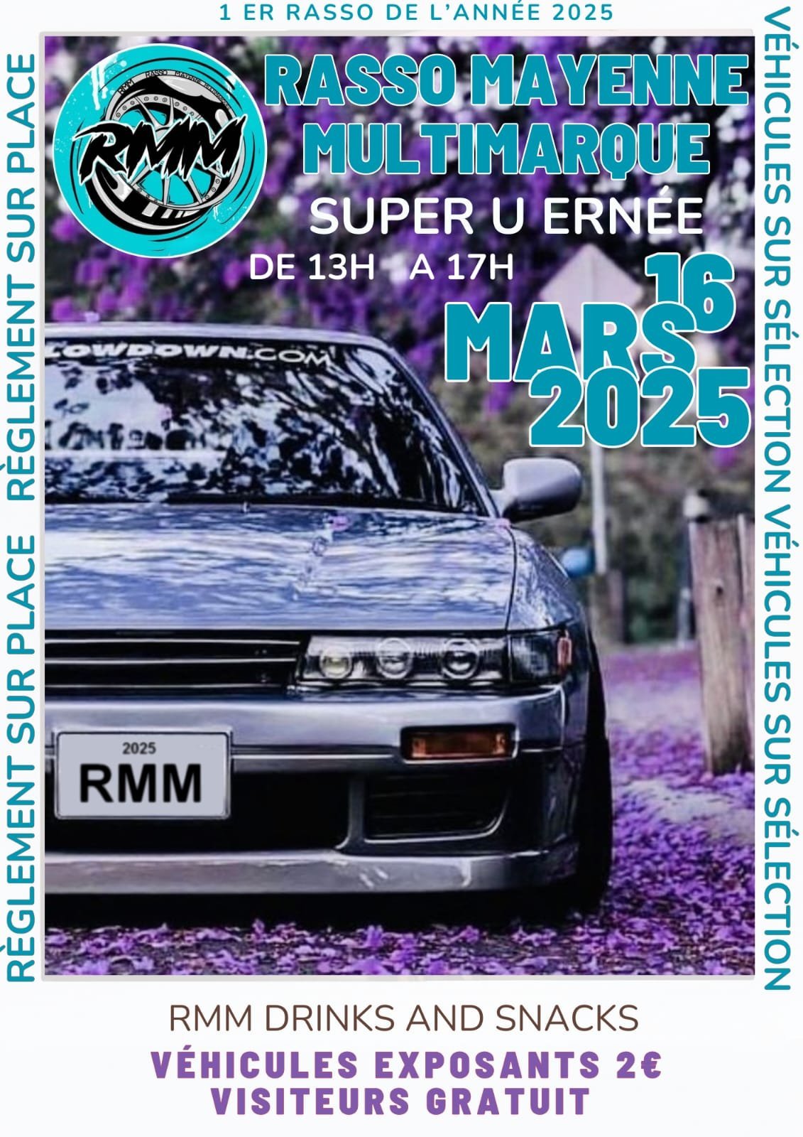L’association Rasso Mayenne Multimarque est ravie de vous convier à un rassemblement sur sélection qui se tiendra le DIMANCHE 16 MARS 2025, de 13H À 17H, au SUPER U, ERNEE. Une participation de 2€ sera demandée par véhicule exposants. Pour ce qui est des inscriptions, elles se passeront soit sur l’événement Facebook, soit via message sur Instagram.
