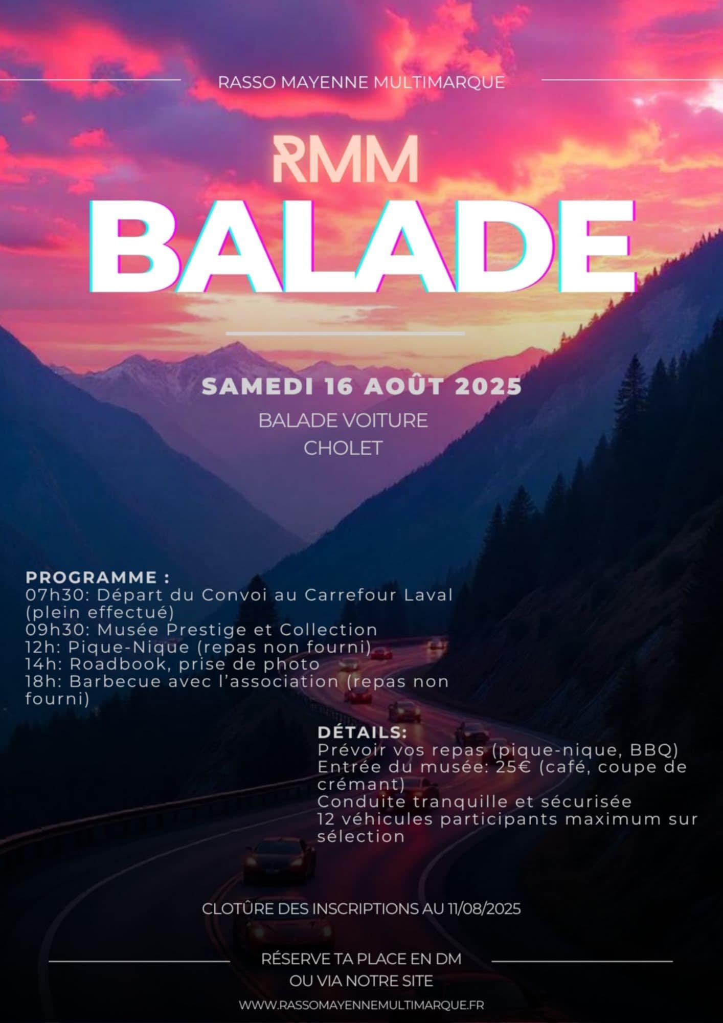 RMM On The Road – Édition Cholet Samedi 16 août 2025 Attache ta ceinture, on part en ride direction Cholet pour une journée 100% passion auto Au menu de cette journée turbo stylée : Départ du Carrefour Laval (plein fait, moteur chaud !) Visite du musée Prestige & Collection – prépare-toi à en prendre plein les yeux (25€) Pause pique-nique (ramène ton casse-dalle !) Roadtrip retour avec spots photos stylés Fin de journée chill autour d’un barbecue entre passionnés (chacun ramène sa grillade ! Aucune obligation d’y participer) Places limitées – Glisse-nous un DM pour t’inscrire ! Parce qu’une balade entre fans de belles caisses, c’est toujours une bonne idée. Let’s ride !